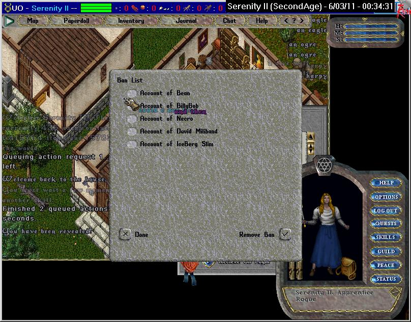 So in this little adventure, I make a char with Hazy's friend's name, get friended, trash the lockdowns I can reach, and finally clear the ban list for him. Not bad for a night's work