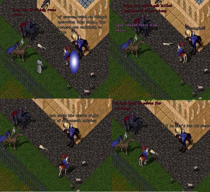 He continues to "claim" we do not belong in Moonglow. I let him know that Lord British allows us to patrol anywhere we want. He thinks it does not make sense that we are there.