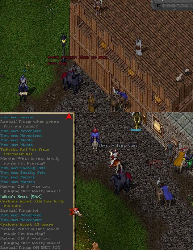 Randall Flagg (who used to be the Chief of Moonglow Police Dept.[link to story about the MPD] who is now GM of the Sunset Riders[link to story of most likely reason MPD was disbanded] ) runs up to us asking about who is going to free HIS miner. Upon hearing the length of time his miner would be incarcerated without bail he is flabbergasted.