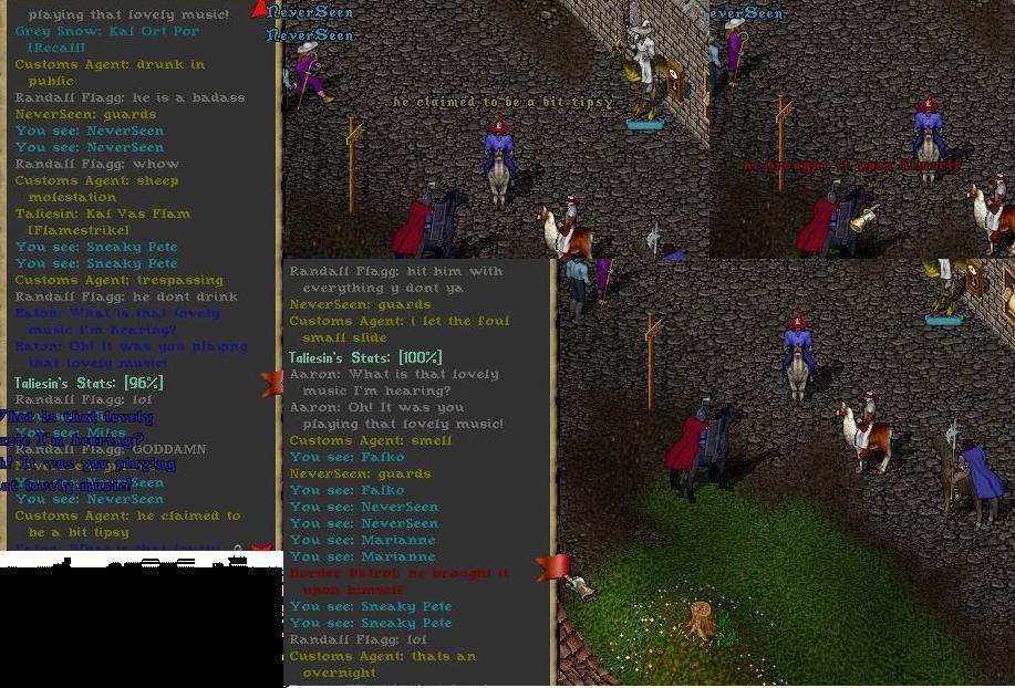 We had went to all of the towns in Sosaria, patrolled WBB a good while, and spent some time in front of BPD HQ making sure of his good well being while he was locked up. A total time of almost 3hrs real world time and 2 or 3 days UO time.