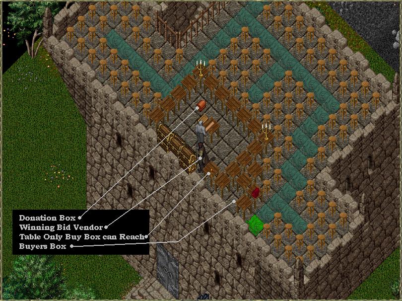 (Note: In cases where the item is not on display or can not go on a vendor, such as a house, the buyer is expected to get in touch with the seller within 24 hours to complete the transaction. In the event of items that can be sold a few at a time, the buyer can purchase stacks one after another until all are purchased. The table marked with the gold coin can only be reached by a person in the buyers box.)