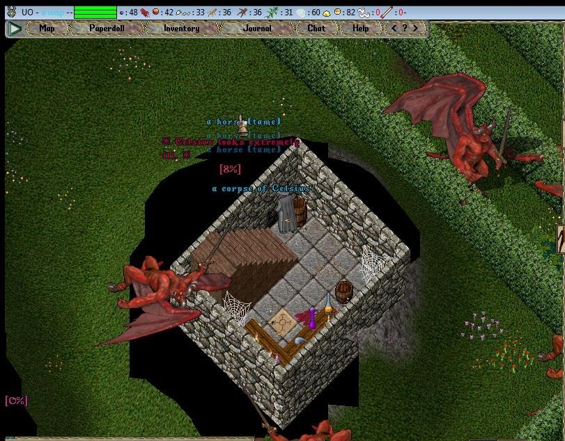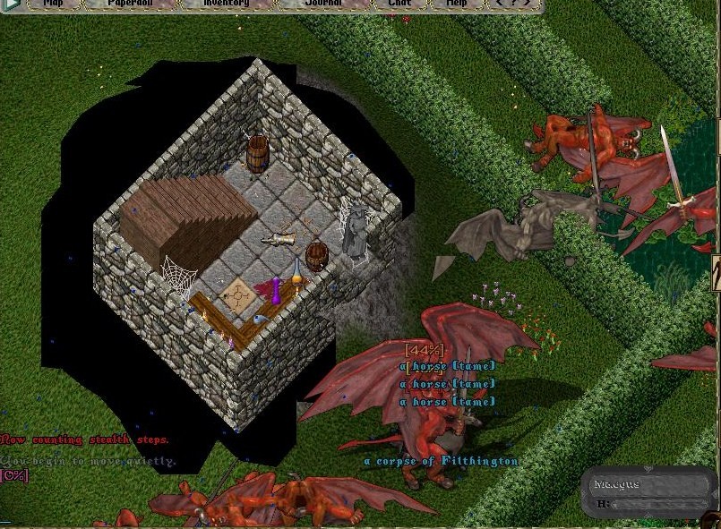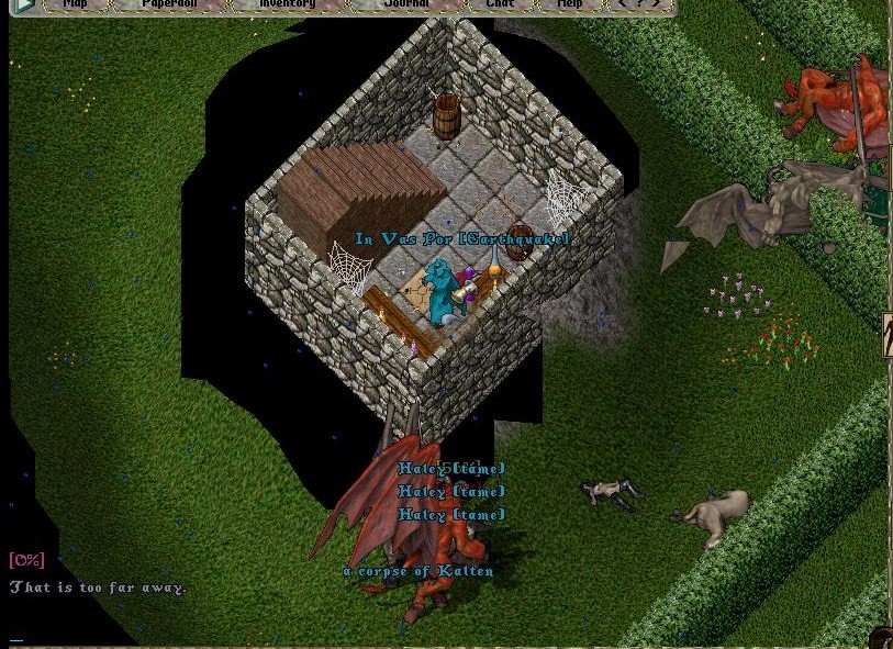 Most of the time people kill the creatures from the safety of the tower top then come down and rummage through the corpses after they are slain. I kept triggering the demon spawn when they went to do so and casting earthquake. There were more people then whats depicted on screen here. Maegus the red was with Filthington and I believe it was an Exodus who came as well who were consistently driven back by the spawn and Earthquakes. It took awhile to gather the remains of the poor Filthington.