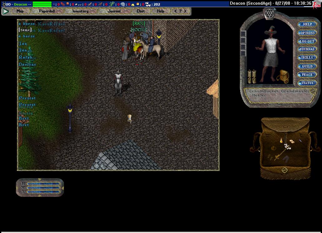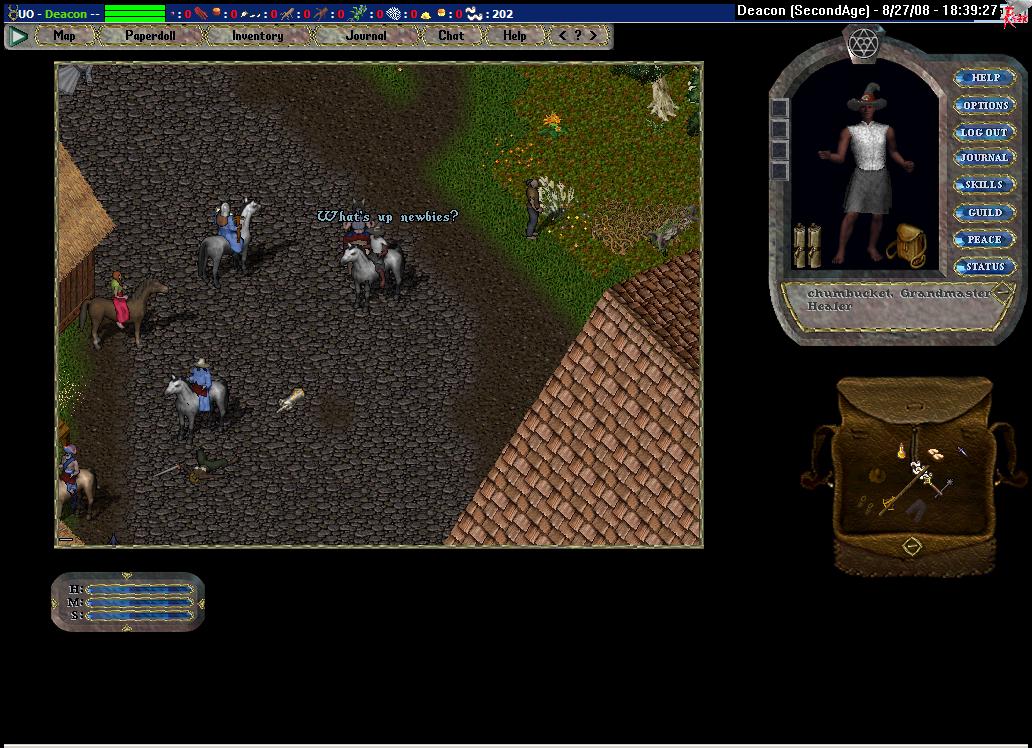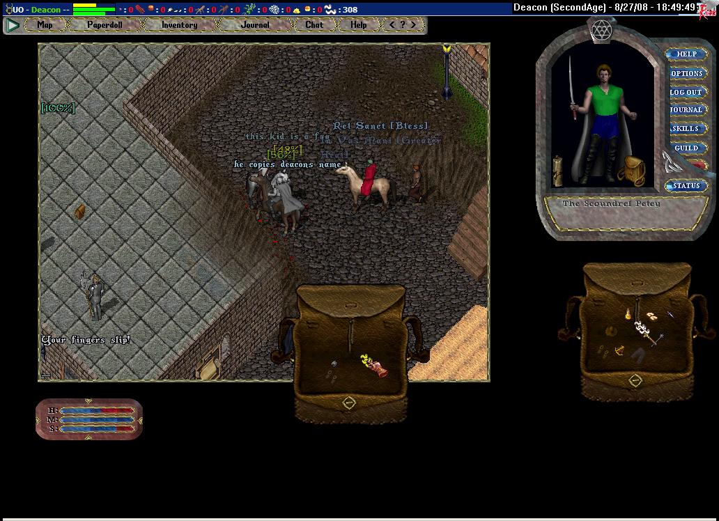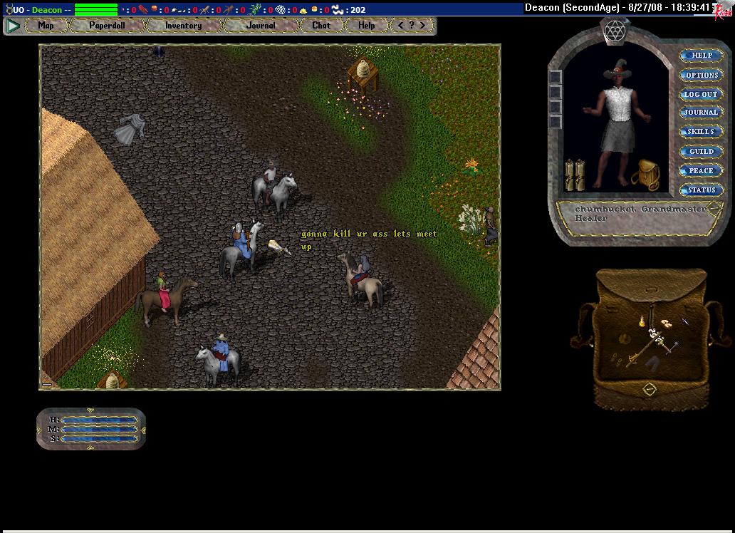I follow him to the stables and at an opportune moment make my move. His bag is nearly empty: bone armor, bandages and a kryss. Some duel this is going to be. I take the kryss, but he doesn't seem to notice. He asks me to gate to the duel location, but I, having no magery, suggest we just walk out of the guard zone. We arrive a large clearing and I dismount. He equips a newbie dagger. Yes, a newbie dagger. I'm somewhat confused, but he attacks me anyways. I remount before the first blows are even traded.
