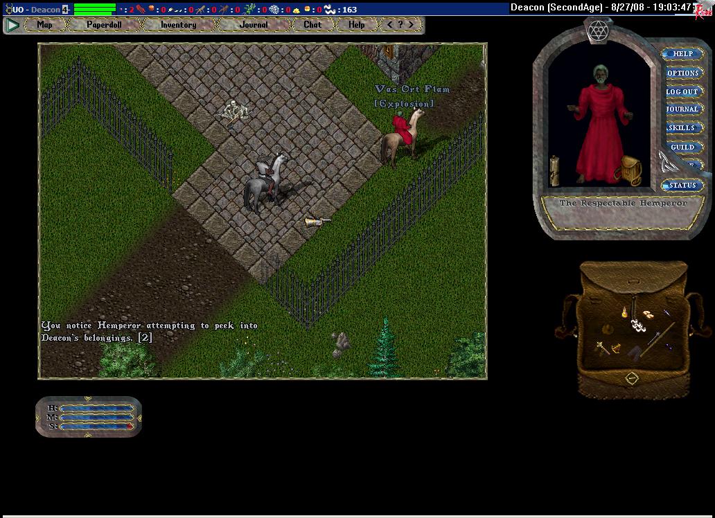 Hemperor's assistance to my enemies leads me to his standard hangout, the Britain Graveyard (where Hemperor can be king). I've killed him so many times that he can simply smell when I am near, even when disguised. He calls me out by name. I ignore and go for the steal. He attacks. He dies.