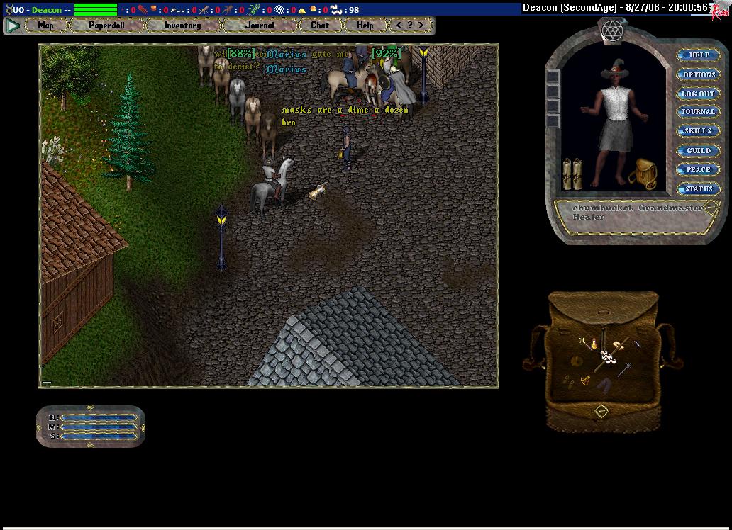 The possibilities are too much. I can't resist. I run to the tailor, buy the outfit I usually see Deacon wear and I'm off to the races. My first encounter does not disappoint. [TG] is assembled at the Skara Brae bank. I approach.
