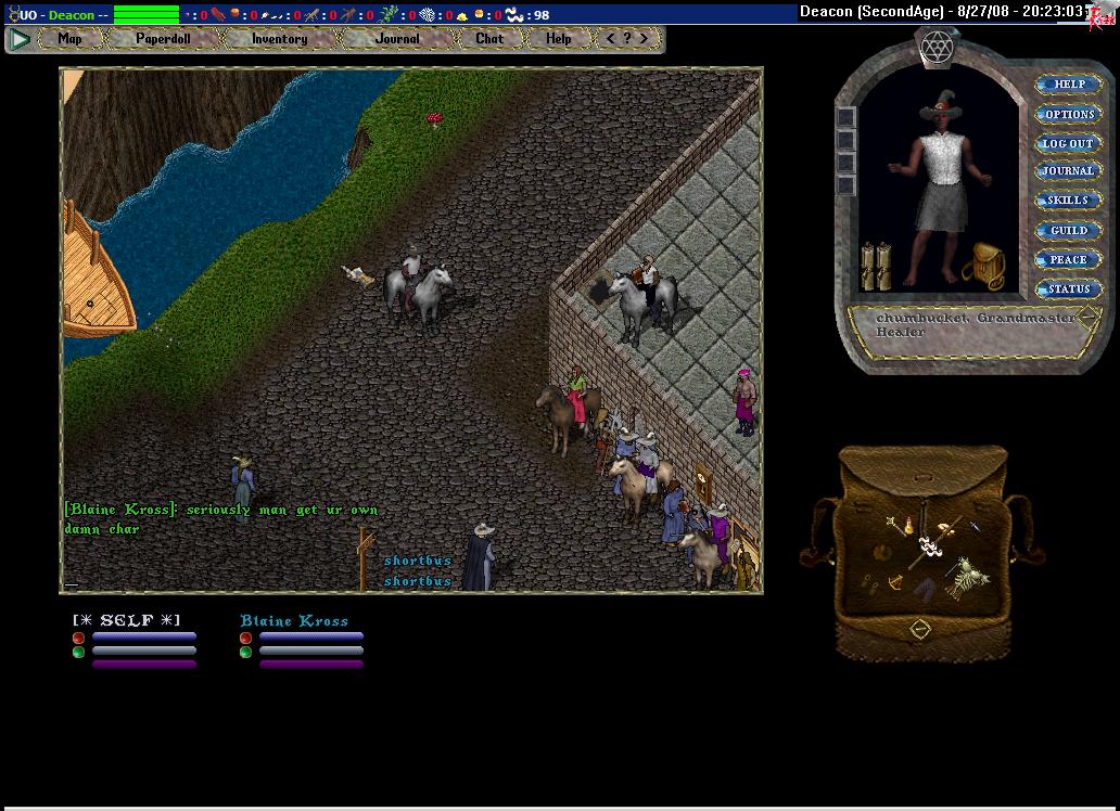 Deacon, of course, is the current leader of the bounty board (soon to be deposed by tinker chum). He is a known PvPer. Now, PvP appears to me like the Beatles would have appeared to Mozart. Yes, it has its charm, but one can't help but look down on it. It has some character, but is too limited. You can't fully express yourself through that sort of thing.