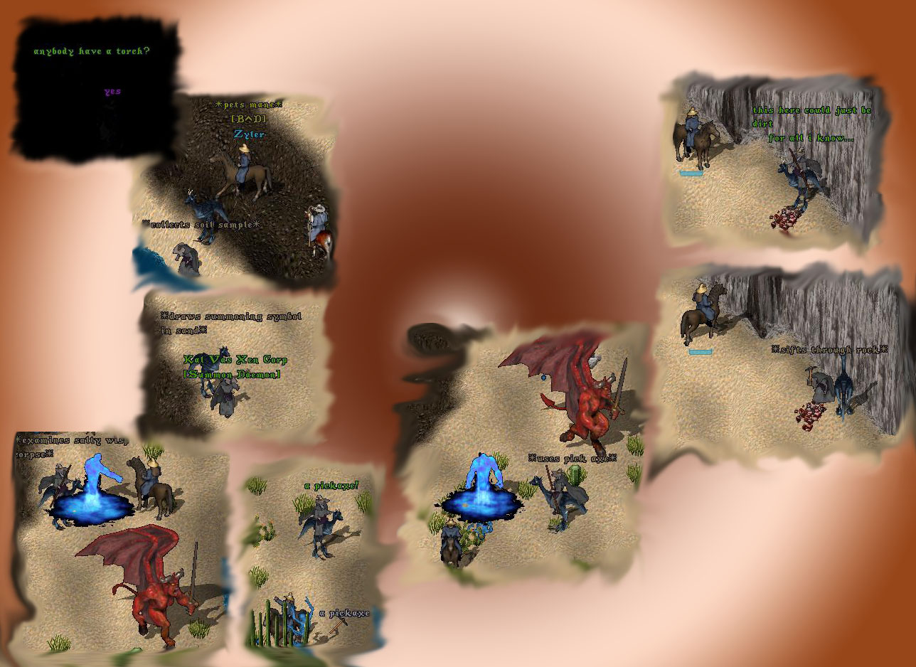 The dark shadow that the fortress has cast over the deserts was no match for your great spells. And with the fury of watery element and the power of the demon, we were able to hold off Ceto's advance forces Just long enough for us to collect the samples we needed. I can't believe how foolish I was to set off on such a task unprepared but I did not expect the ground to be so resistant to magical means of mineral extraction. How fortunate it was for us to find a pickaxe there upon the shore!