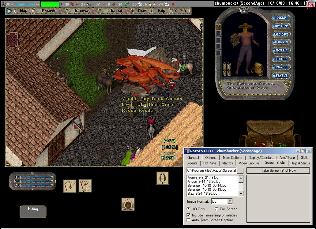 I manage to get resurrected and back to Britain to find my dandyish friend waiting, a few dragons in tow--not the entire army. I go for the nightshade again. He goes for the paralyze. I flee. After a few minutes of this, I notice that he has ceased to move. I fear he may not be at his computer. What do do?