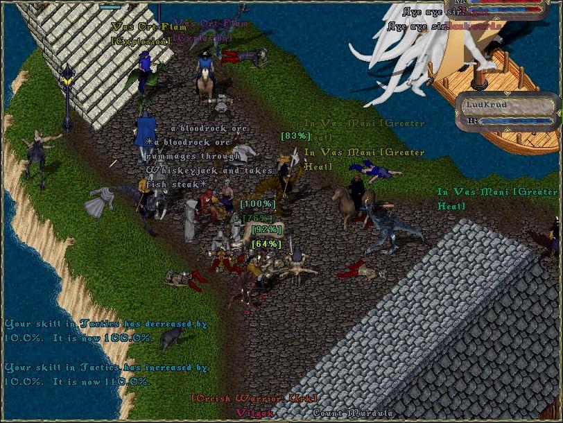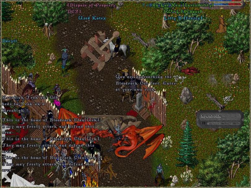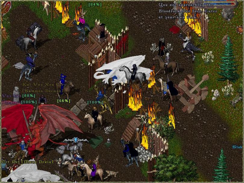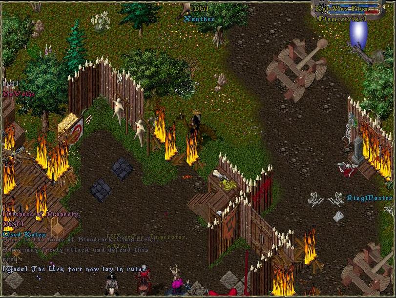 The book proved most helpful, and is reproduced here in its entirety. Armed with the plans on how to build a catapult, the humans felt so emboldened that we decided to take the fight to their fort. The sheer number of warriors and pets present made easy prey of our foes. However the filthy URK summoned a deamon so powerful all our efforts to kill him were met with dire failure!! Not even the realms largest beasts were a match for it!! Fortunately, the plans for a catapult came in handy, and Lord British's finest crafters quickly built one of the catapults to begin the siege of the fort. The destruction came quickly after. However much we advanced in destroying the fort, Krenbluk was still going strong, and taking human lives!! Then, out of the blue, like a strike of lighting from the Gods, one of the projectiles from the catapults destroyed the altar built for the Krenbluk. It was then, the sheer power of the mages and warriors summoned, prevailed!! Humanity has risen again and prevailed!! The fort lay in ruins, but no matter what we do, I fear the soil has been too tainted with evil blood.