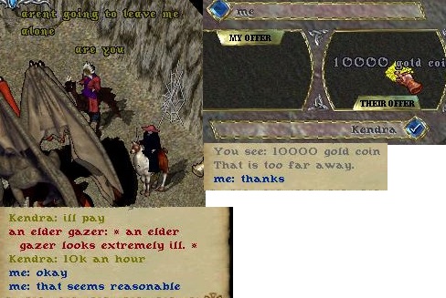 This was the day we found our nemesis, Tamers! And PL and eBK. Day started off with us checking the popular spawns for people. Found a tamer (Kendra) along with some other cronies camping the spawn (among them mr. Seventh Son), with 500 dragons. Elder Gazer corpses popped up like there was no tomorrow, so we assumed they wouldn't miss a little amount of gold.