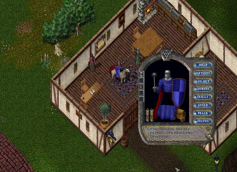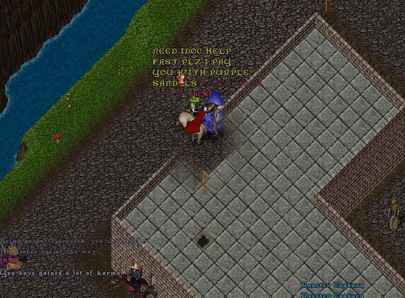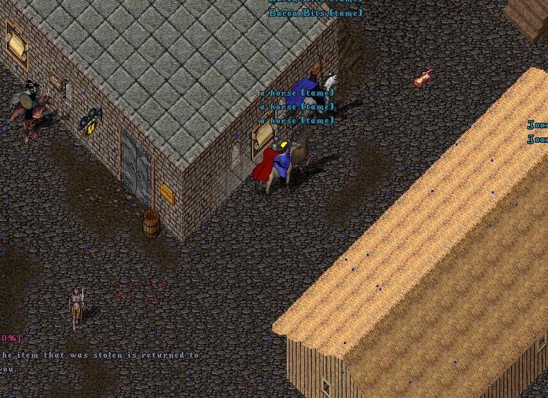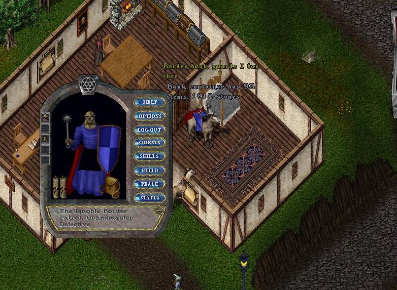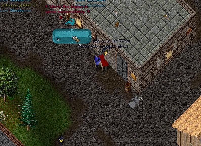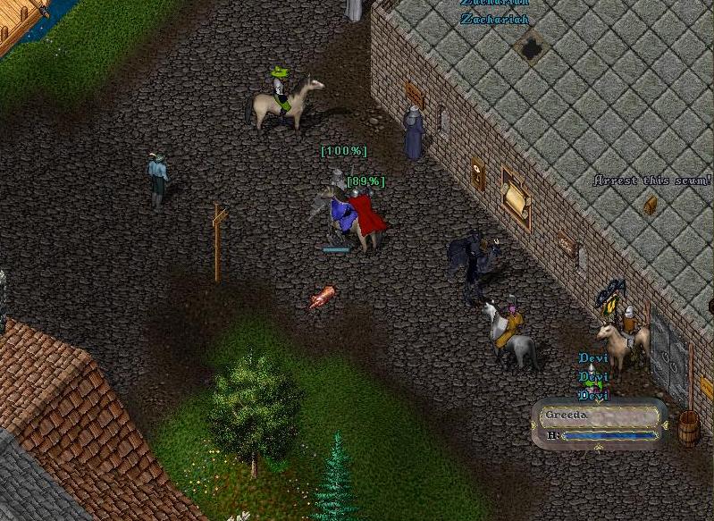 I unequip my weapon and trusty shield and start spamming my scroll to the rune with a macro. As the criminal sees me spamming it and fizzling because of my horrible magery and being physically hit, the criminal exclaims "Some one stop him!"