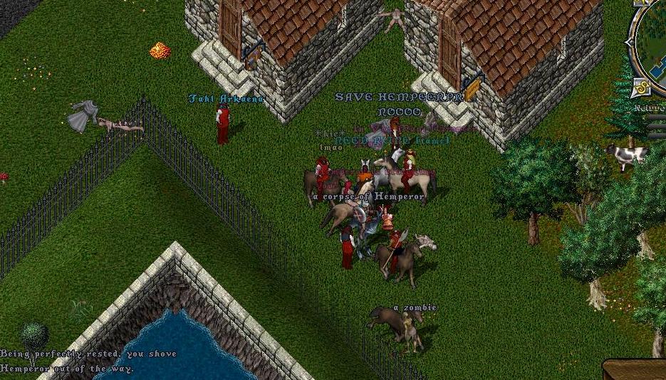 Ok I see what is happening, Nerrio was there my bad I didn't even know. But he had nothing to do with Hemperors defeat. The battle wasn't as short as you think. He was dropped very quickly and I have many pics showing it which I will include in my tale of adventure. I had to run around and kill the Hemperor healers before I could even hope to kill Hemperor. I have the pic of Nerrio dead as he was blasted while Hemperor was constantly healed. When this was going on I was to busy fighting Bear Gyllis another person that made the mistake of attacking me. Once teh tame, jill, and bear gylllis were finished, Hemperor then preceded to charge me with his halberd, at this point I was completely alone surrounded by surcoats. It was then and there that I took down your hero.
