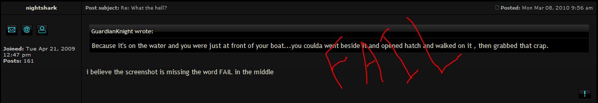 GuardianKnight wrote:Because it's on the water and you were just at front of your boat...you coulda went beside it and opened hatch and walked on it , then grabbed that crap.