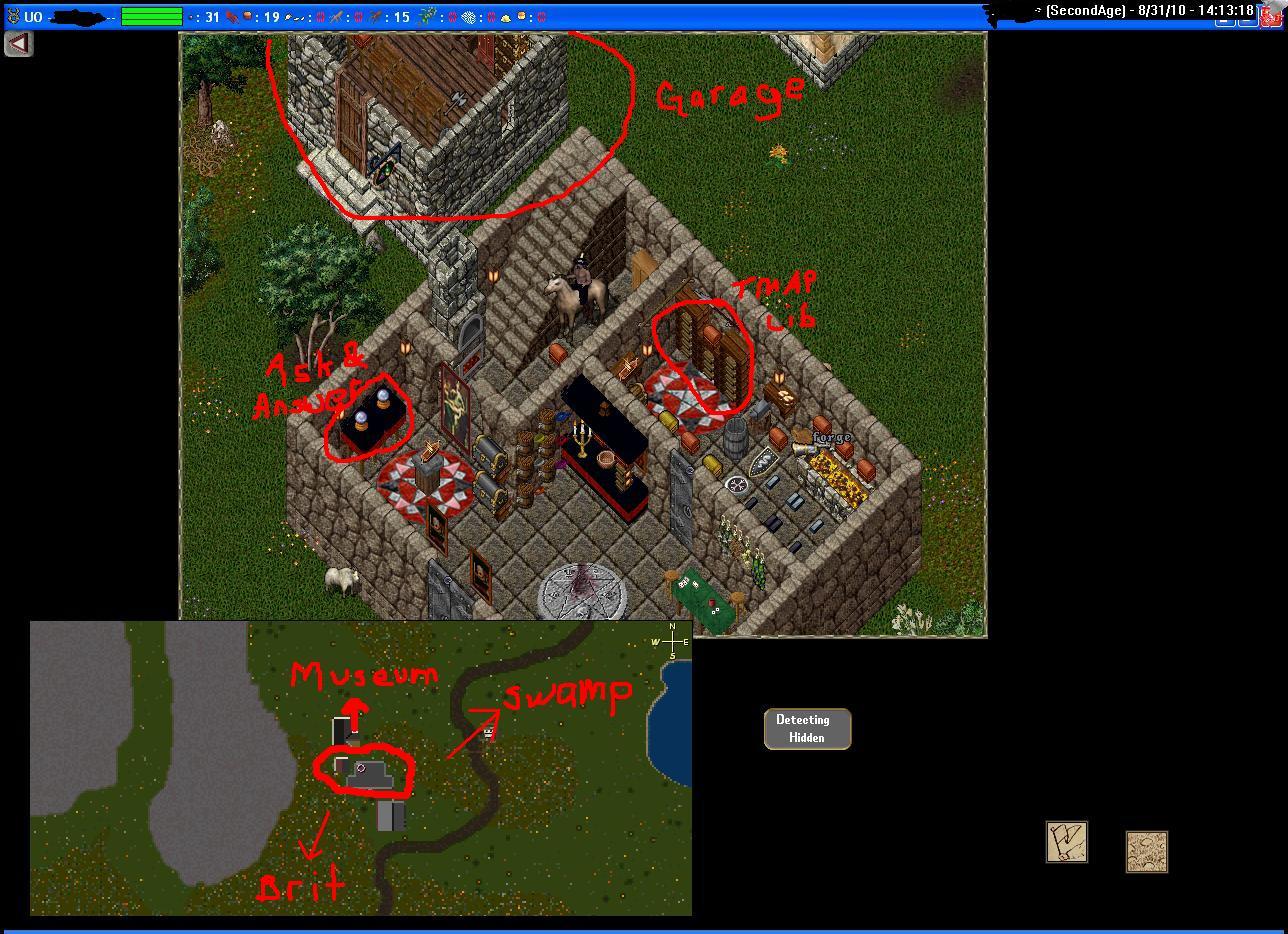 I don't feel like moving all my crap out, so I'm gonna sell it with my stuff. Theres a TMap rune lib, a couple of ask/answer balls, Dungeon hot spot lib, some regs (about 2k of each), and some other random stuff.. no major rares though =/. There's also 70 level 1 Tmaps and 10 MiB's in the wooden box above the TMap lib. You can train on the roof with ur buddies too!