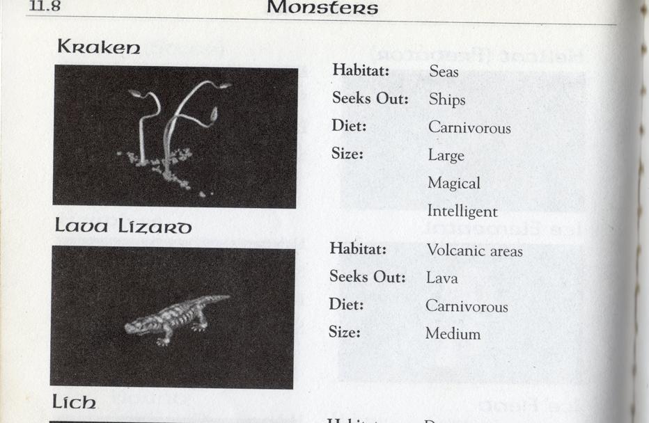 I had seen one before in game, but I dont remember where or when, since I didnt venture around in dungeons much, and spent most of my time mining and fighting around in forests, and getting PKed there. It was a blueish corpser. Below is the pic of the kraken from the manual, and a patch note from 1998 which mentions krakens being patched along with a number of other creatures to be agressive.