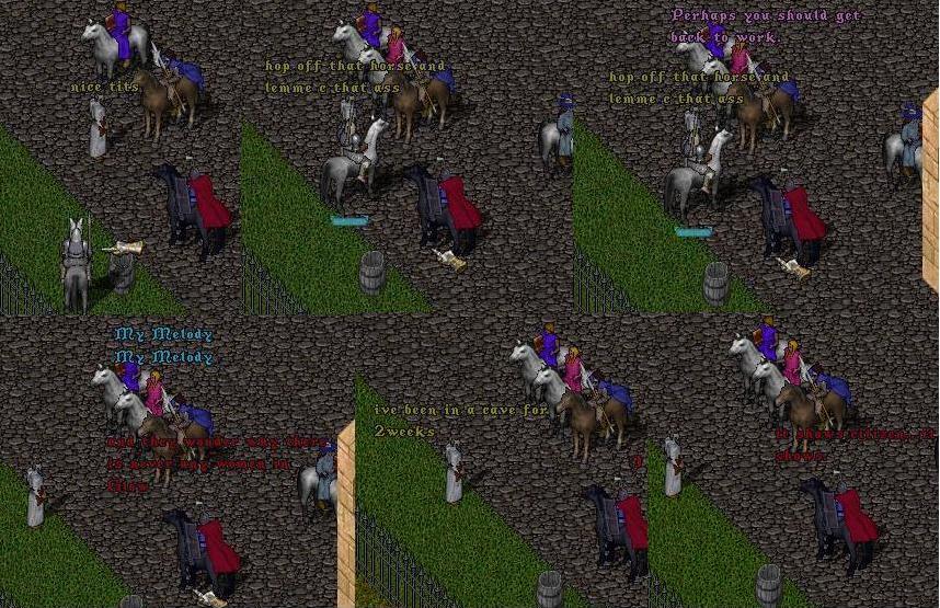 He then offers to hire us as his personal mining body guards. Captain Turbo informs him that public officials working under Lord British are not to be contracted out. He is upset by this and offers us sexual favors. I quickly respond letting him know that the BPD do not take sexual favors from anyone. He then turns his attention to cadet Shirley Colmes who is one of our female officers.