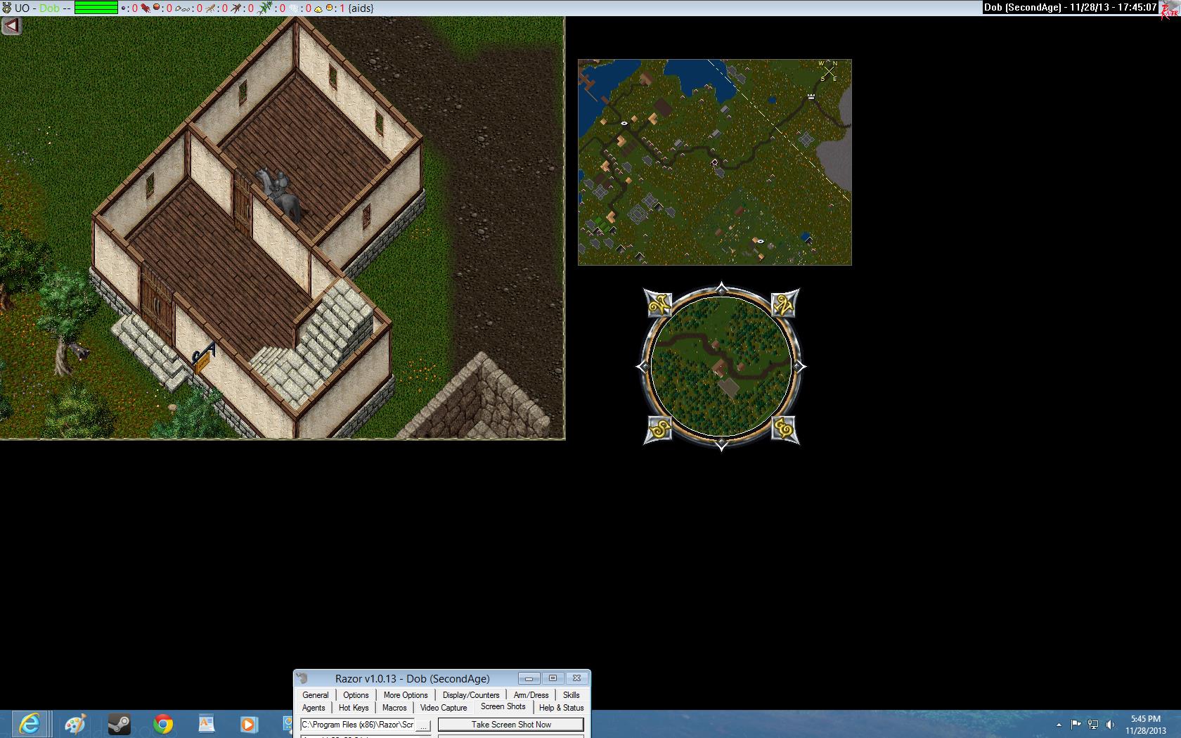 Up for auction is a 2 Story L-Shaped house placed right on the road between Skara Brae and the Hedge Maze. A few screens east takes you the NW corner of the Hedge Maze and a short walk down the road west takes you to the Skara Brae docks where you can cross into the town. Also to the SW is the player run town of Scoobyville, complete with a tower rune library. This house comes with tailoring and blacksmithy addons as pictured upstairs. A great home in a great location. I will let this run 24hrs after last bid.
