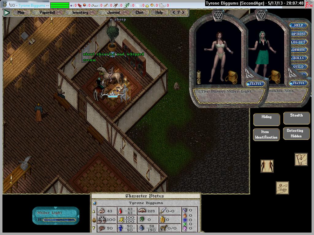 It all started one day when I woke up and realized I had smoked all of my rocks the night before, so I set out to try and score some more crack to smoke. From my experience I have found the best way is to sneak around and look at what people have and if I want it I take it. Sometimes I get away, sometimes I don't. This particular fine evening I found myself wandering around in the city of Skara Brae when I stumbled upon two fine ladies (Nina and Miller Light) in a secluded room. One of them was naked! I thought, they may be trying to hide something in there, maybe even some crack?? So I stealth my way in the room unnoticed and let me tell you what I saw: