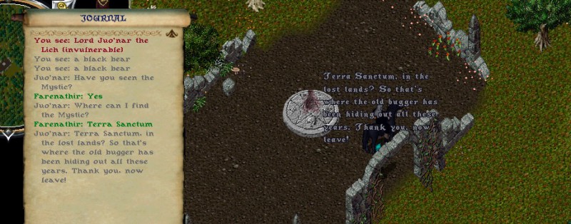 After carelessly giving away the Mystics location, I hurried over to warm Mythran that his location had been compromised. Mythram had much to speak of with regards to both the Lich as well as the Warlock! Apparently the threat of both of them released upon Sosaria could spell the end of the world!