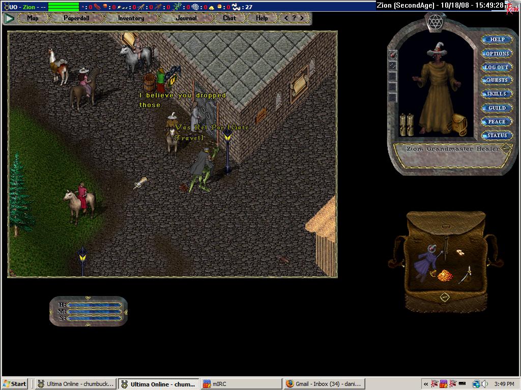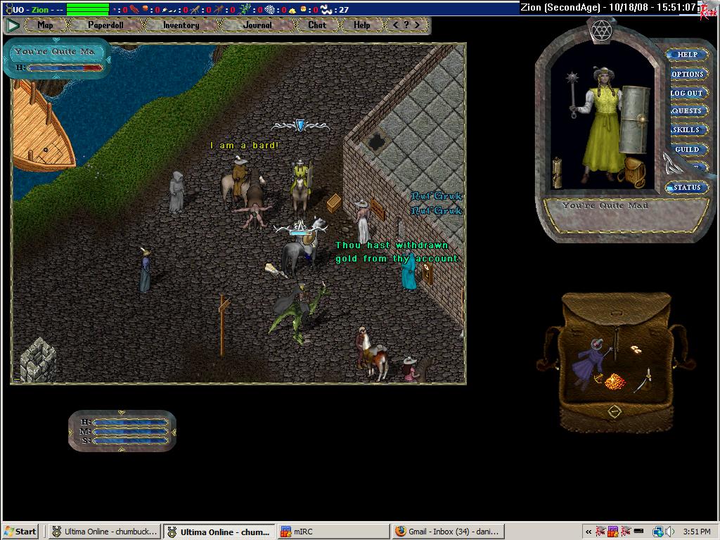 Rather than continue her vain attempts at killing the very man who has saved her life, she bolts for a nearby house. Being a chivalrous and noble bard, I leave her runebook and her gentleman friend's reagents on the porch and depart for Britain. His black clothing is the cost of his treachery. On arriving, I find she has already made it to the bank. One last time, I ask for even a small showing of gratitude for my valiant efforts.