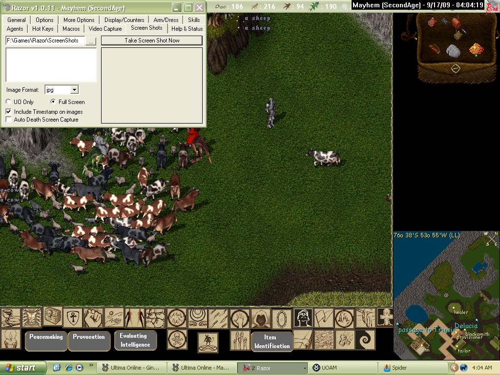 Back in T2A on OSI I once brought more than 80 head of cattle to the Del bank. I guess the lag caused so many problems the cows were deleted by GMs and I got jailed for a while then dumped in the middle of nowhere without a mount or rune. When I got back, I was still bored so I covered everytile of the farmlands outside Del with animal hides. From the hills to the water, took me like 4 hours and about 9 screenshots pieced together to capture it all. Too bad my computer died years ago and I lost it all, along with my GM program from beta UO.