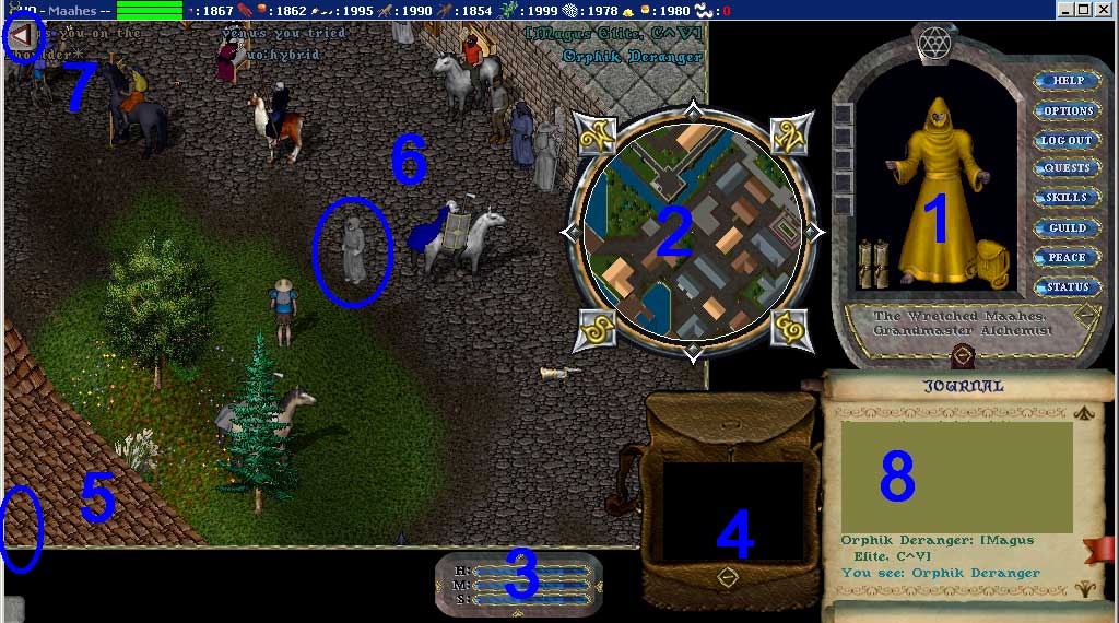 3. Status Bar: This displays your health, your mana, and your stamina. Double clicking the status bar will open a more descriptive gump. You can open your status bar by click and dragging on your player (#6) or by pressing ALT-S.